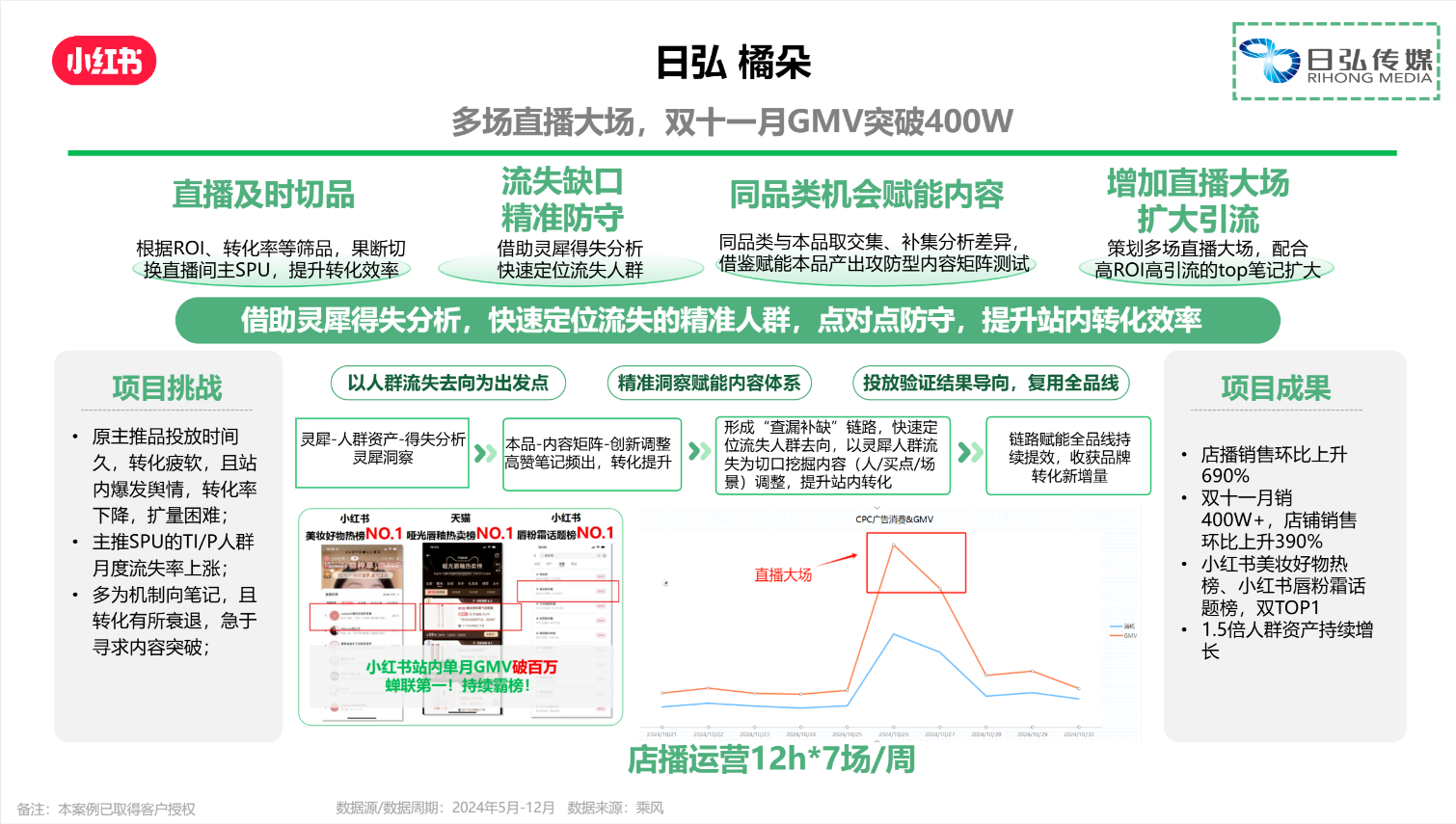 从种草到站内转化:运用日辰独创的BFLM模型(Brand企业号+Feeds信息流+Live直播+Mall商城),实现生意的快速增长。